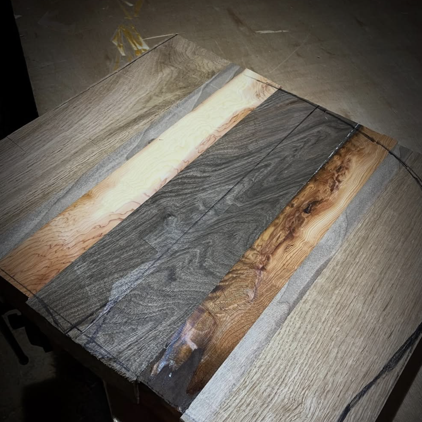 Using wirewool (iron) and vinegar (acid), I am able to produce the blue/black colours in my work simply by allowing the natural chemistry of the tannin in Oak to react with them.